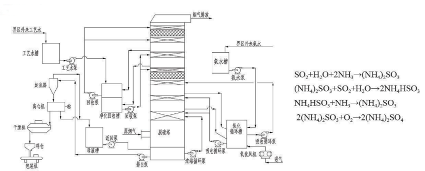 硫銨系統(tǒng):采用飽和結(jié)晶工藝,吸收系統(tǒng)產(chǎn)生一定固含量的硫酸銨漿液,再進(jìn)行固液分離、干燥和包裝,產(chǎn)出商品硫酸銨;