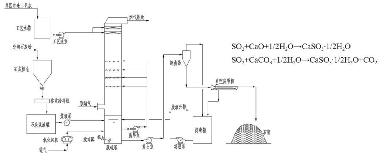 環(huán)石灰石/石灰-石膏濕法煙氣脫硫工藝采用廉價(jià)易得的石灰石或石灰作為脫硫吸收劑,石灰石經(jīng)破碎磨細(xì)成粉狀與水混合攪拌成漿液。當(dāng)采用石灰作為吸收劑時(shí),石灰粉經(jīng)消化處理后加水?dāng)嚢柚瞥晌諠{液。在吸收塔內(nèi),吸收漿液與煙氣接觸混合,煙氣中的二氧化硫與漿液中的碳酸鈣以及鼓入的氧化空氣進(jìn)行化學(xué)反應(yīng),最終反應(yīng)產(chǎn)物為石膏。同時(shí)去除煙氣中部分其他污染物,如粉塵、HCl、HF、SO3。脫硫后的煙氣經(jīng)除霧器除去帶出的細(xì)小液滴,經(jīng)熱交換器加熱升溫后排入煙囪。脫硫石膏漿液經(jīng)脫水裝置脫水后回收。該技術(shù)采用單循環(huán)噴霧空塔結(jié)構(gòu),具有技術(shù)成熟、應(yīng)用范圍廣、脫硫效率高、運(yùn)行可靠性高、可利用率高、工程造價(jià)低的特點(diǎn)。