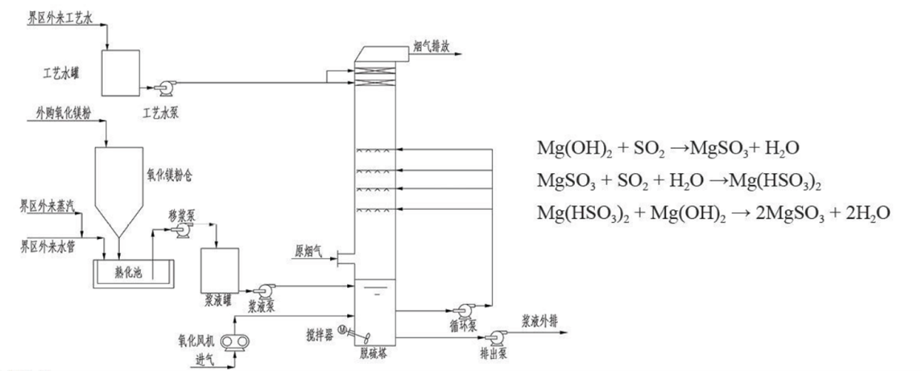 氧化鎂脫硫是一種成熟度僅次于鈣法的脫硫工藝,即利用氧化鎂粉和工藝水桉照一定比例混合在—起,熟化制成一定濃度的氫氧化鎂漿液,送入吸收塔中,漿液自上而下和煙氣中的二氧化硫進行逆向接觸反應(yīng),生成亞硫酸鎂和硫酸鎂。