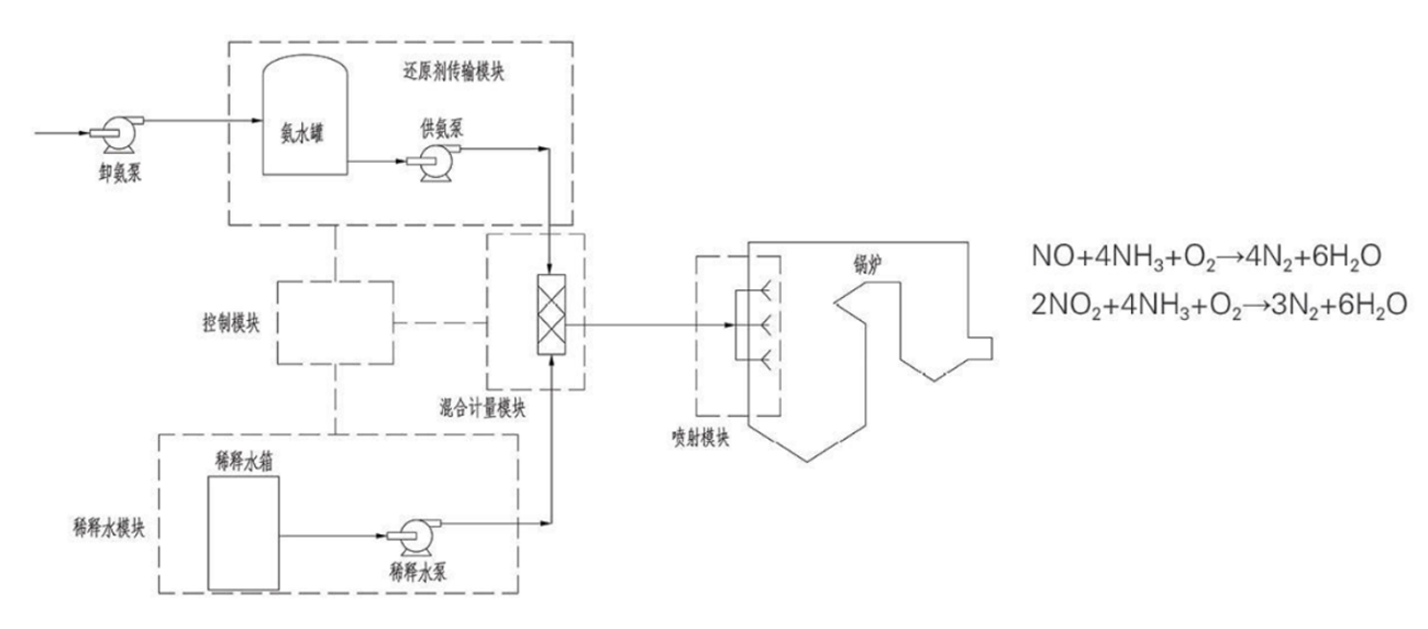 將氨水(質(zhì)量濃度20%~25%)或尿素溶液(質(zhì)量濃度20%~80%)通過霧化噴射系統(tǒng)直接噴入爐膛合適溫度區(qū)域,霧化后的氨與NOX{ NO、N02等混合物)進(jìn)行選擇性非催化還原反應(yīng),將NOX轉(zhuǎn)化成無污染的N2。